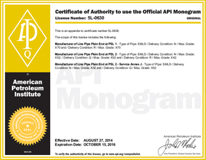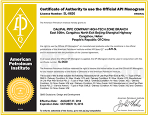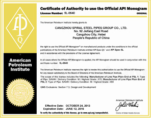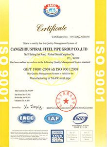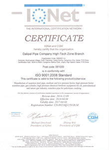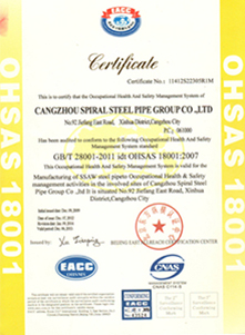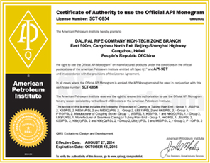 La avanzada tecnología de producción, equipos de prueba perfecta, y el control estricto proceso aseguraron fiabilidad y estabilidad de nuestra calidad. El grupo ha obtenido sucesivamente dichos certificados como Licencia Fabricación de República Equipos Especiales Popular de China, API Spec 5L y API Spec monograma 5CT certificados, ISO9001: 2000 certificado de sistema de calidad internacional, OHMS18001: 1999 Sistema de Gestión de Seguridad y Salud Ocupacional certificado ISO 14001: 2004 certificado de Sistema de Gestión Ambiental, nos convertimos en el proveedor cualificado de Departamento de Compras (Energía No.1. net) de CNPC, y también somos el proveedor cualificado de Sinopec.